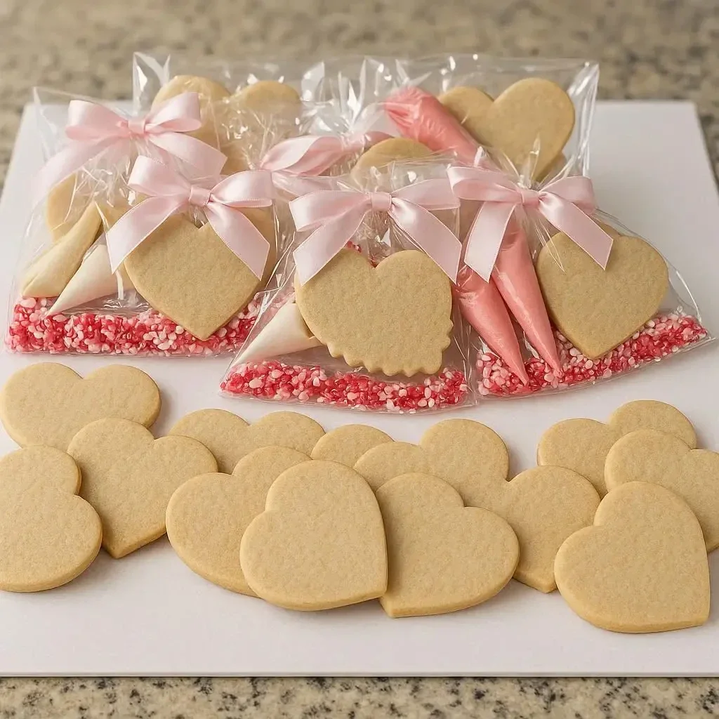 This sweet decorating DIY kit includes one heart-shaped sugar cookie, two piping bags of icing in coordinating pink, white, or red shades, and a festive mix of sprinkles.